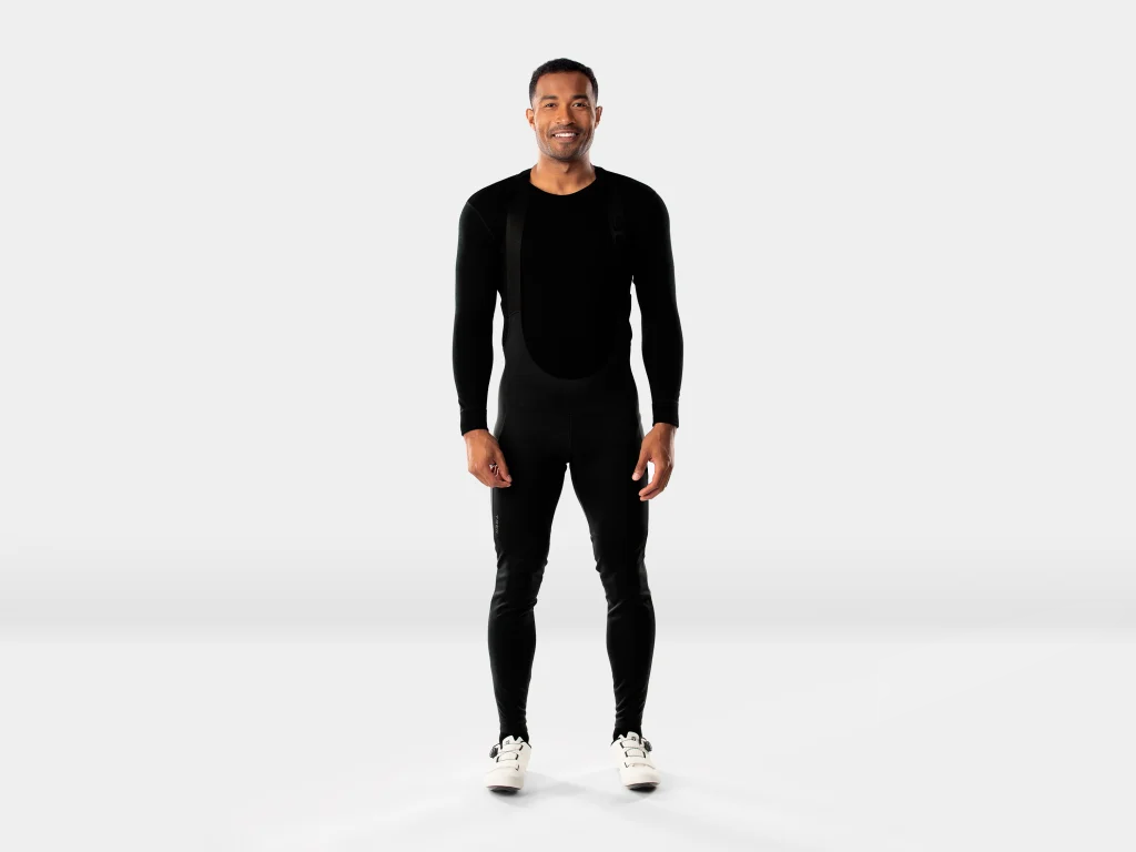 Długie spodnie rowerowe z szelkami i wkładką zapewniające ochronę przed wiatrem i wodą i pozwalające na jazdę przez cały rok.