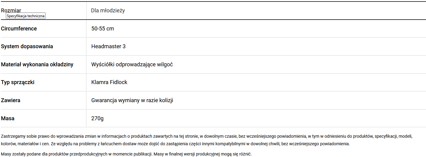 6. Spełnia wymagania norm ASTM. W próbach wykonywanych w ich ramach wykorzystuje się mniejszy model głowy, bliższy młodym rowerzystom