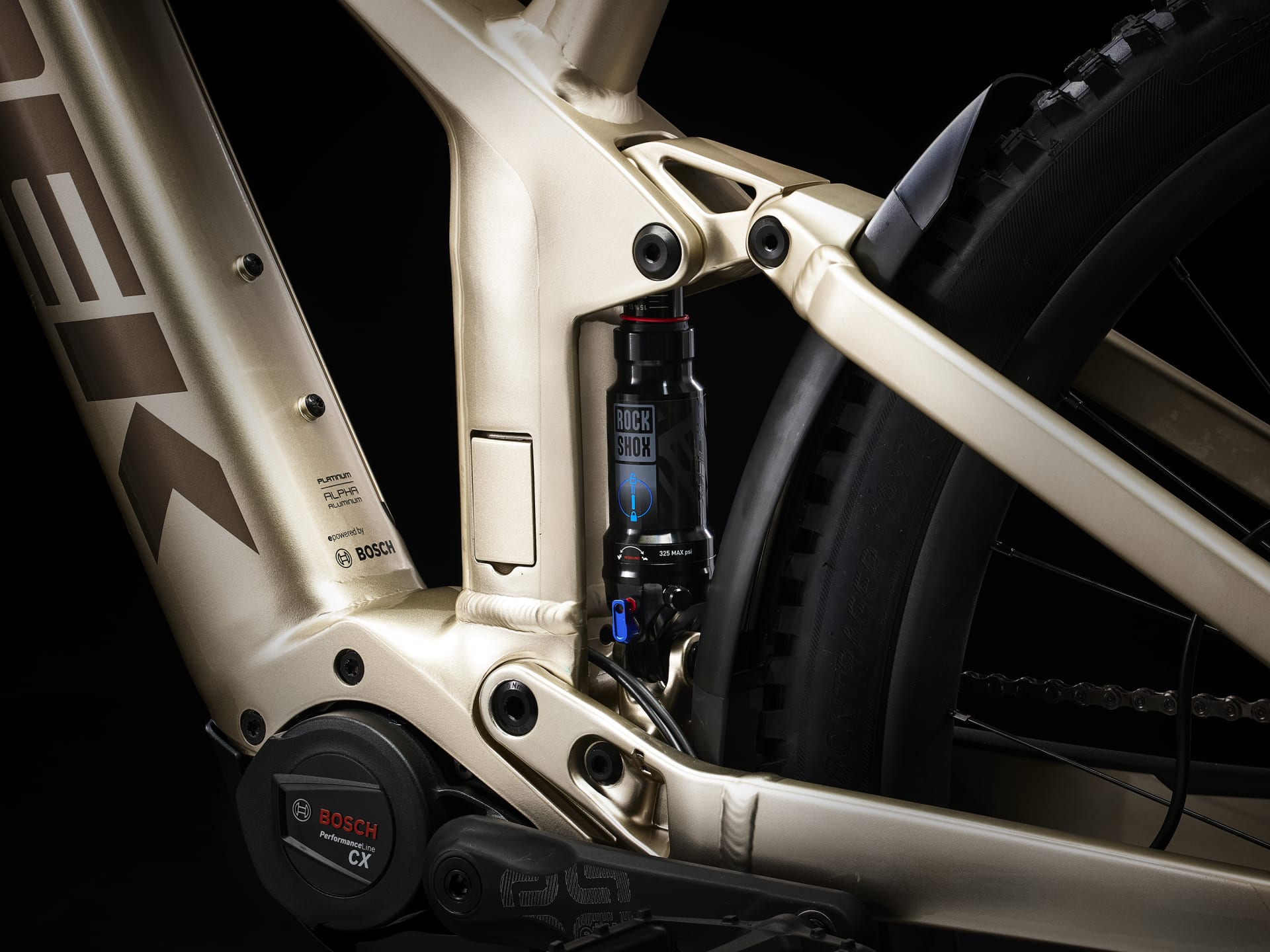 Alpha Platinum Aluminum, zintegrowany wymienny akumulator RIB (ang. Removable Integrated Battery), zwężana główka ramy, wewnętrzne prowadzenie linek, osłona Motor Armor, łącznik wahacza, mocowanie bagażnika i błotników, ABP, Boost148, 100 mm skoku |
