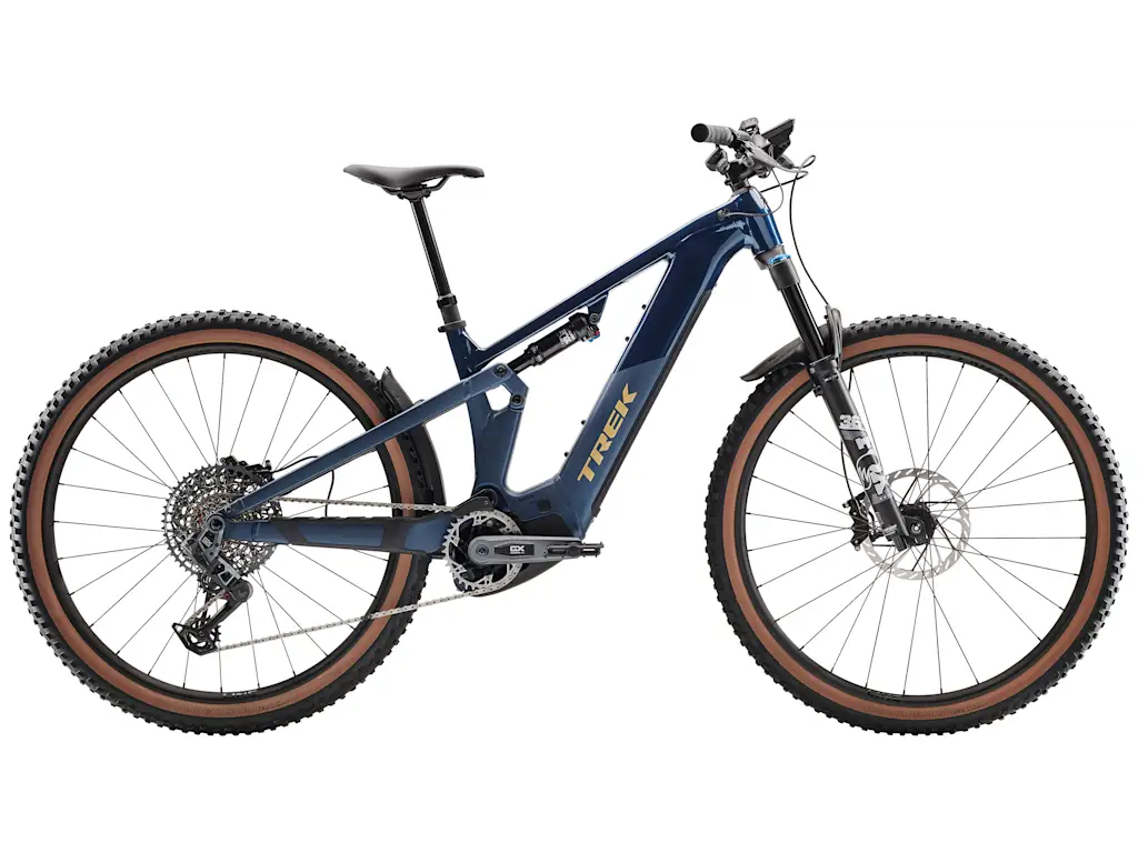 Rama Alpha Platinum Aluminium z silnikiem Bosch Performance Line CX (85 Nm, 250 W), wymienny zintegrowany akumulator PowerTube RIB 2.0 o pojemności 800 Wh oraz kontroler Purion 200. Zawieszenie o skoku 130 mm w postaci widelca Fox Rhythm 36 oraz 120 mm z tyłu dampera FOX Float Rhythm. Gotowe na montaż bezdętkowy koła z odpornymi na przebicia oponami 2,4”, płynnie zmieniający przełożenia napęd SRAM GX Eagle AXS T-Type, regulowana sztyca podsiodłowa Bontrager Line i hydrauliczne hamulce tarczowe.