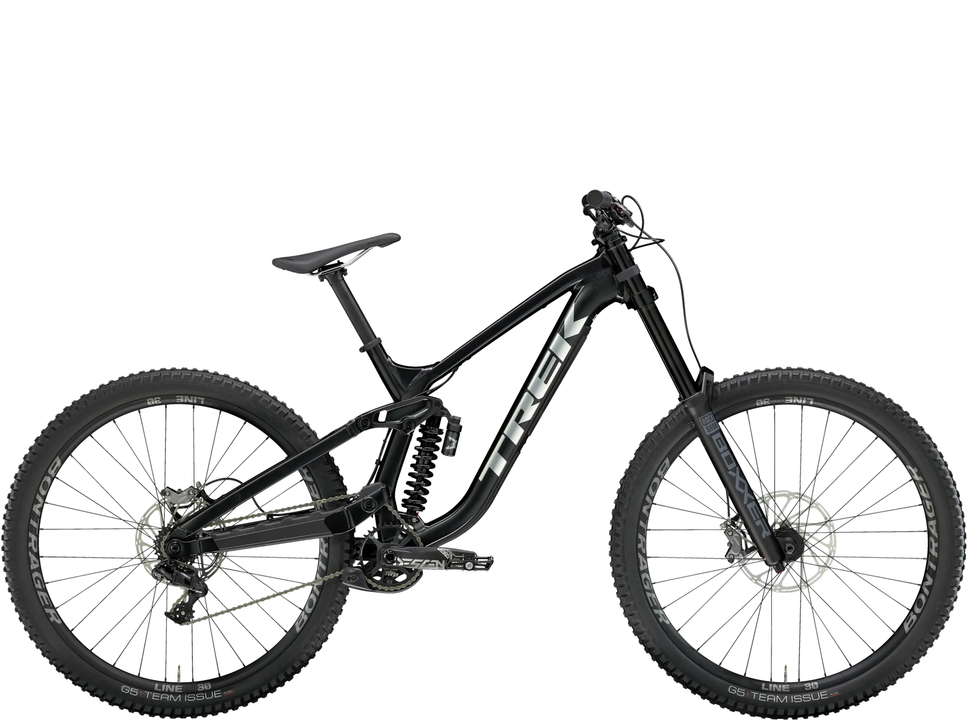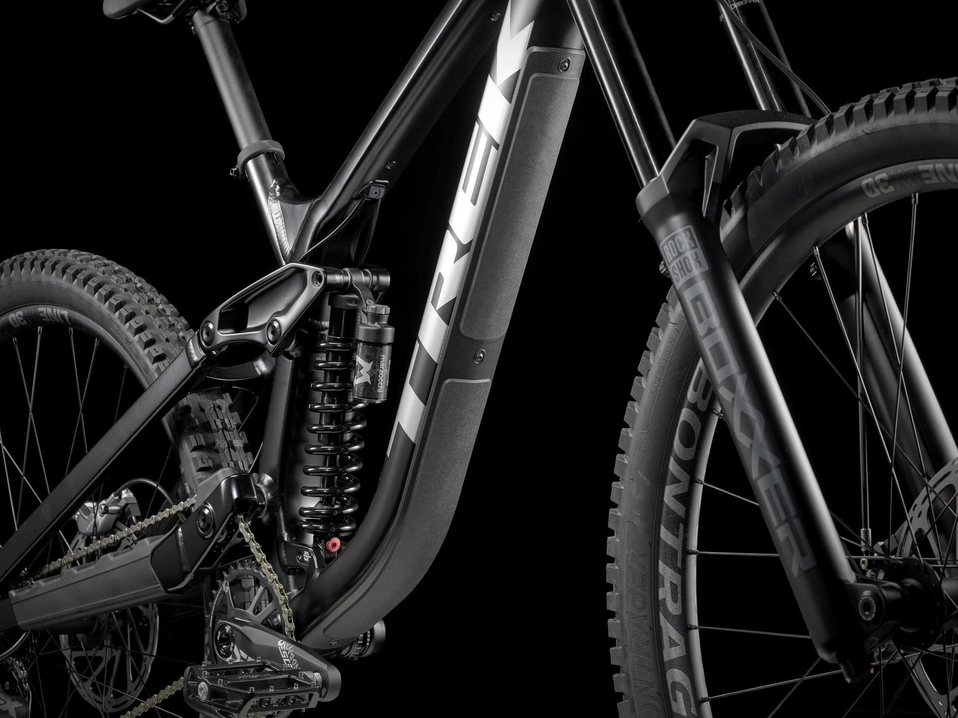 Mocna rama ze stopu aluminium, 200 mm skoku z tyłu z damperem Marzocchi Bomber, amortyzator 200 mm RockShox Boxxer Select z płynnym tłumikiem Charger RC, mocne hamulce 4-tłoczkowe Code R i 7-biegowy napęd SRAM GX.