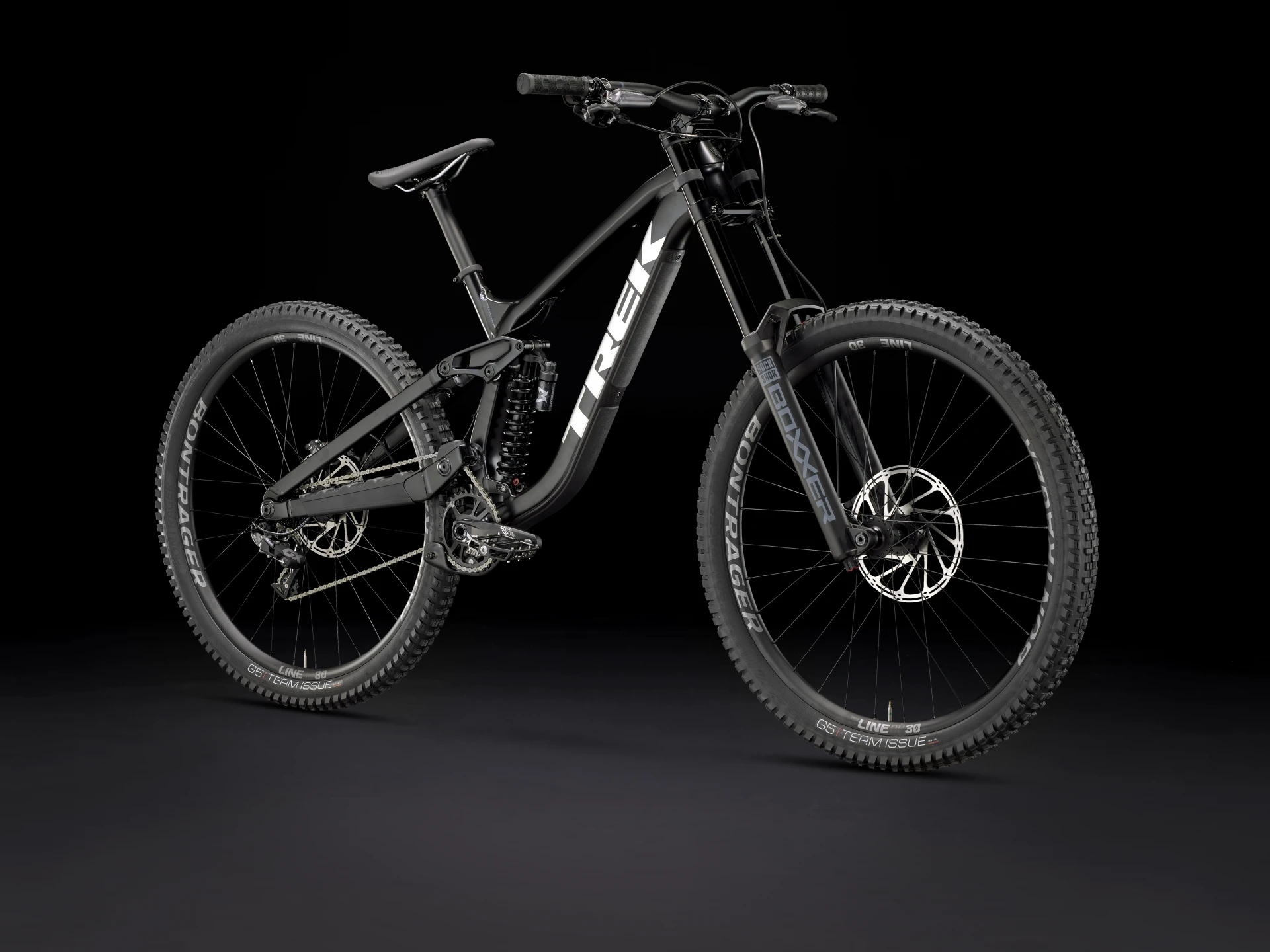 Koło przednie:   Bontrager Line DH 30, przystosowane do zastosowania bezdętkowego Tubeless Ready, tarcza na 6 śrub, oś przelotowa 110 x 20 mm Boost, 29 cali