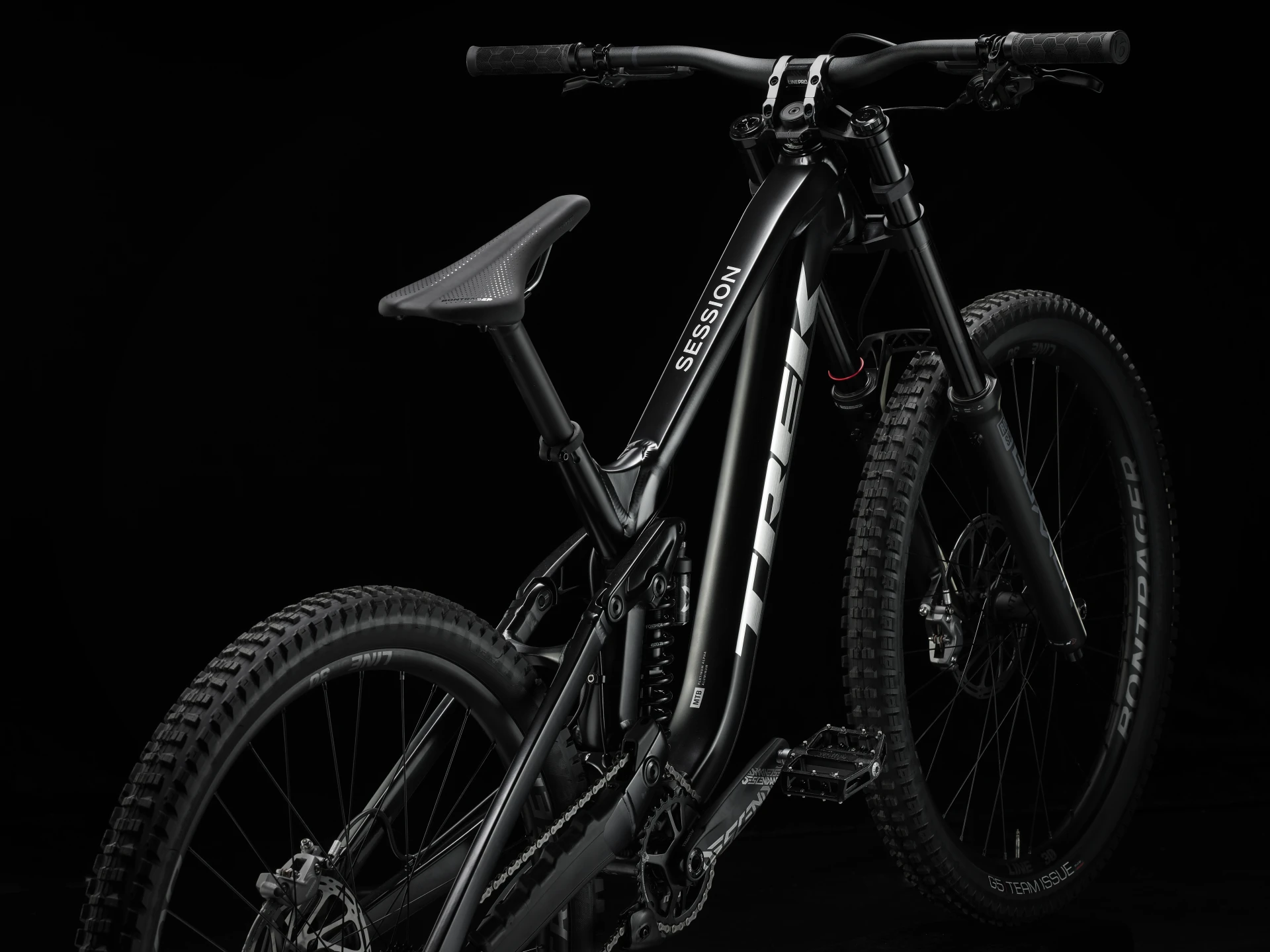Koło tylne:   Bontrager Line DH 30, przystosowane do zastosowania bezdętkowego Tubeless Ready, Rapid Drive 108, na 6 śrub, bębenek Shimano 7 biegów, oś przelotowa 157x12 mm, 29 cali