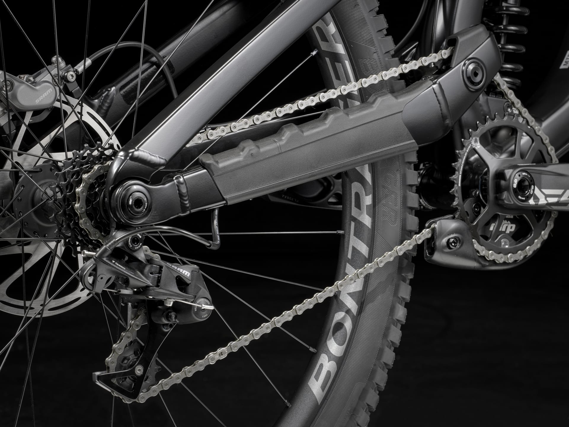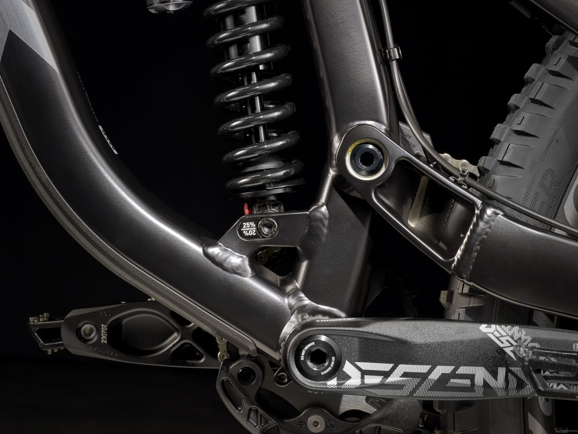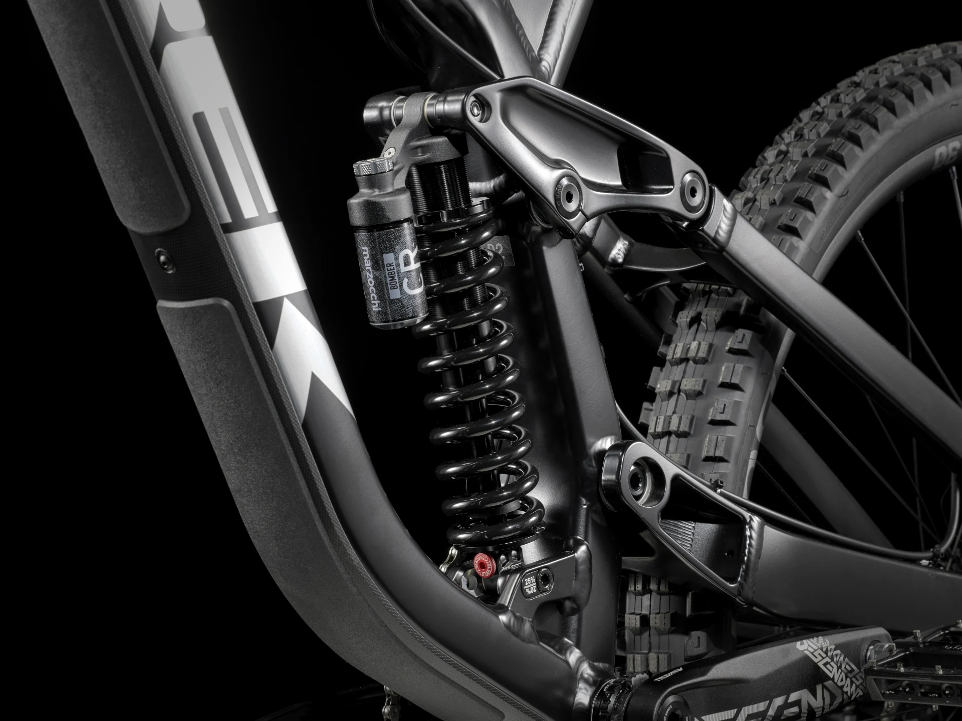 1. Nowa konstrukcja zawieszenia z wysokim punktem obrotu i napinaczem poprawia przyczepność, jedzie szybciej i ogranicza „pedał kickback”, czyli cofanie pedałów przy pracy zawieszenia, dla większej stabilności.