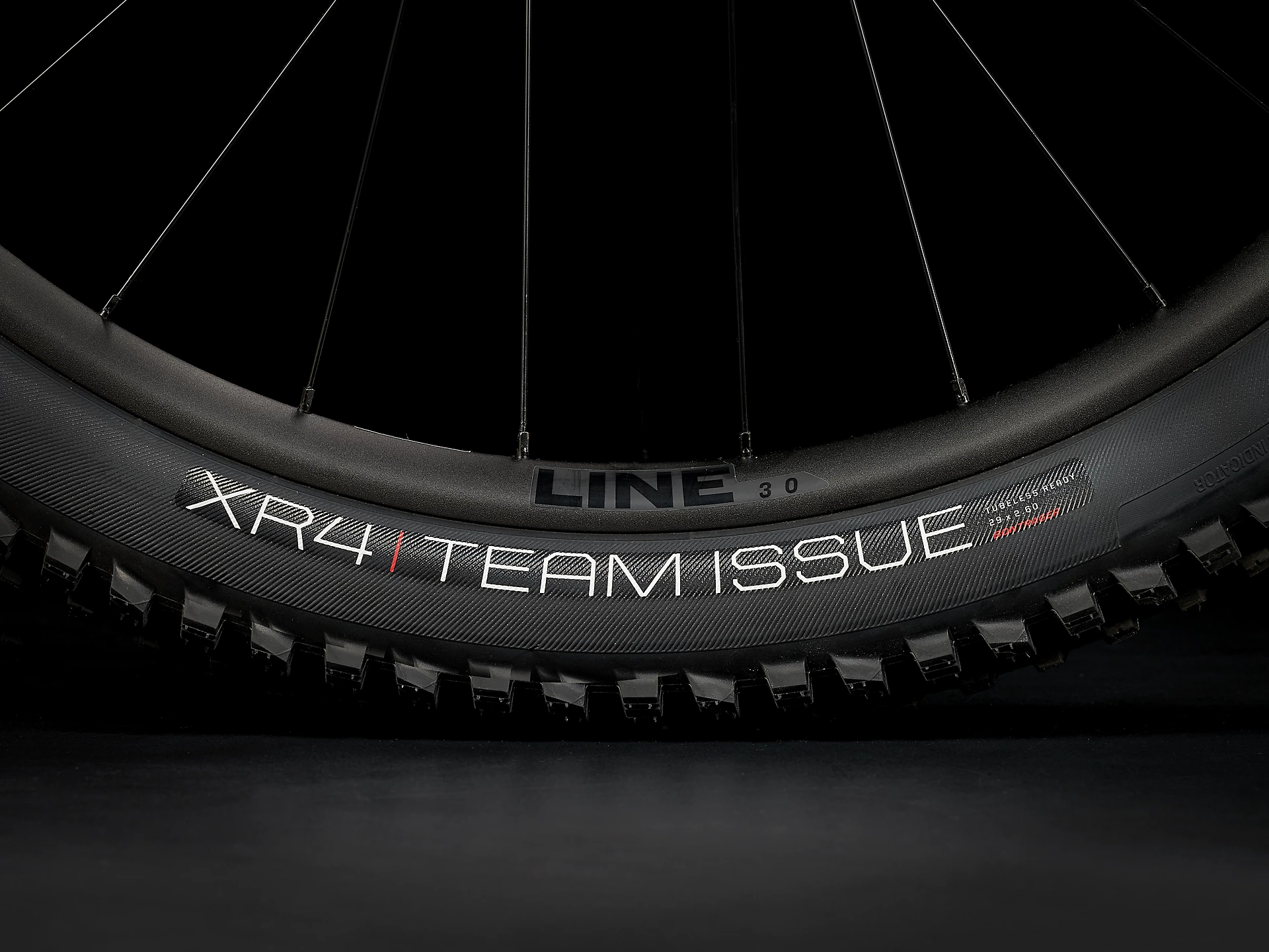 Opony:   Bontrager XR4 Team Issue, przystosowana do zastosowania bezdętkowego Tubeless Ready, ściany boczne Inner Strength, stopka z aramidu, 120 tpi, 29 x 2,60" (27,5 x 2,60" rozm. XS)